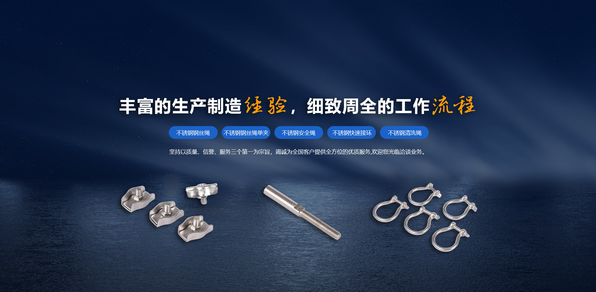 我公司生產(chǎn)不銹鋼鋼絲繩,鋼絲繩配件,不銹鋼索具配件等,是一家集研發(fā)、生產(chǎn)、銷售、售后為一體的綜合性企業(yè)。